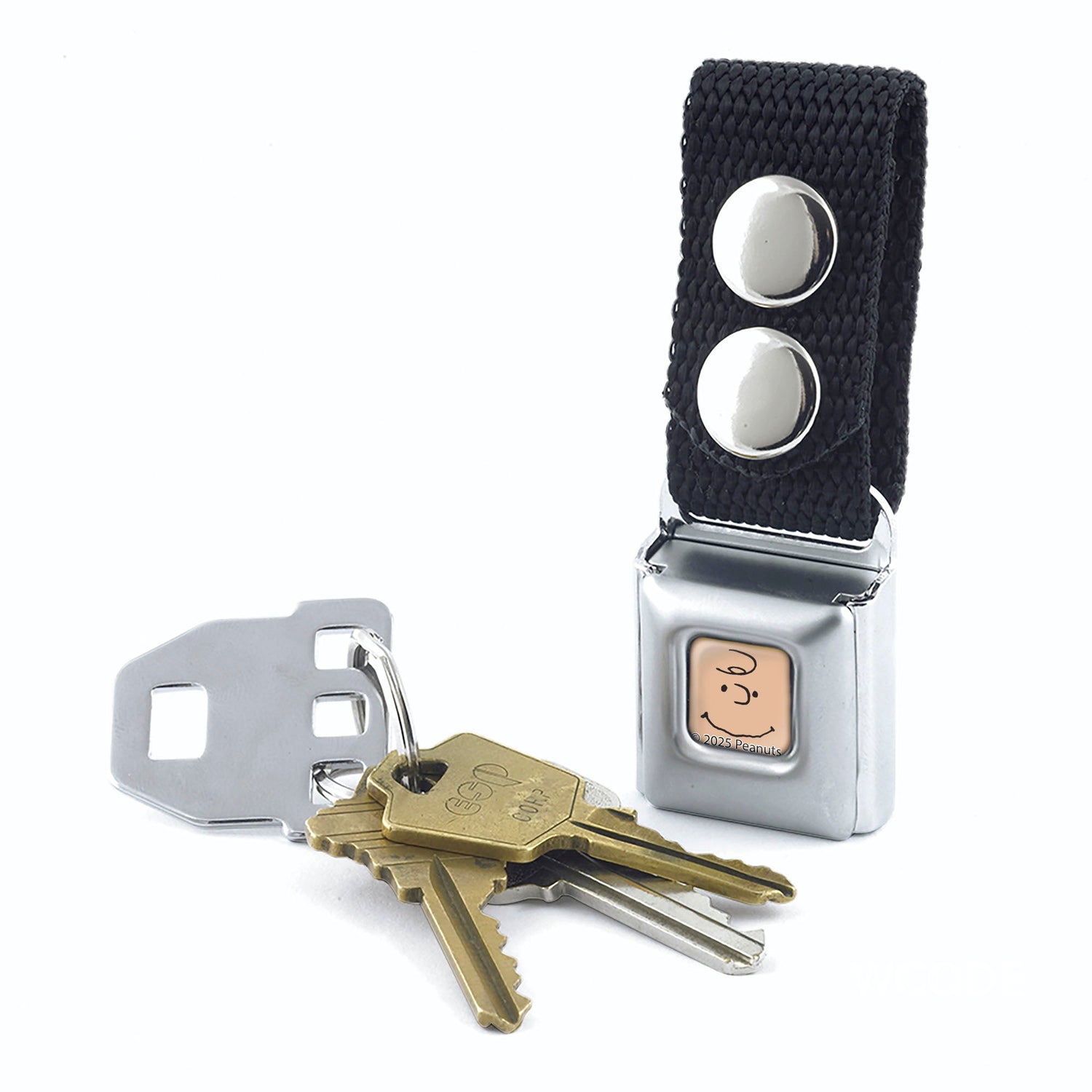 This Peanuts Charlie Brown Face keychain from The Peanuts Store features an authentic SeatBelt Buckle clasp. You can attach it to a belt loop or bag with two strong stainless steel snaps. When you need to detach your keys, simply press the center button. This keychain is officially licensed by Peanuts Worldwide LLC.