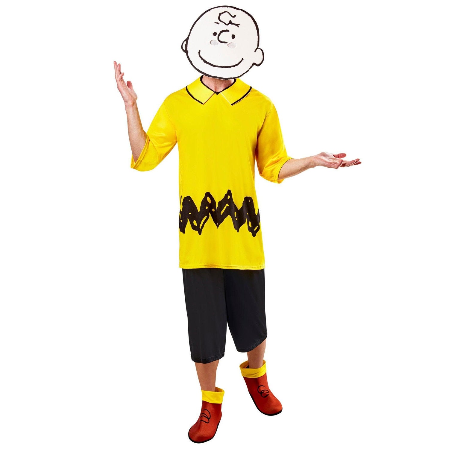 Head to the party wearing our Peanuts Mens Charlie Brown Costume and you'll have everybody zinging one-liners from their favorite old school Peanuts television show. With this set, you will receive everything you need to become the comic strip "lovable loser" we all have come to adore. Featuring a classic yellow shirt with black accent designs, a pair of black shorts and matching boot covers, as well as a Charlie Brown cartoon headpiece, you do not want to miss out on this classic get-up.Product Details