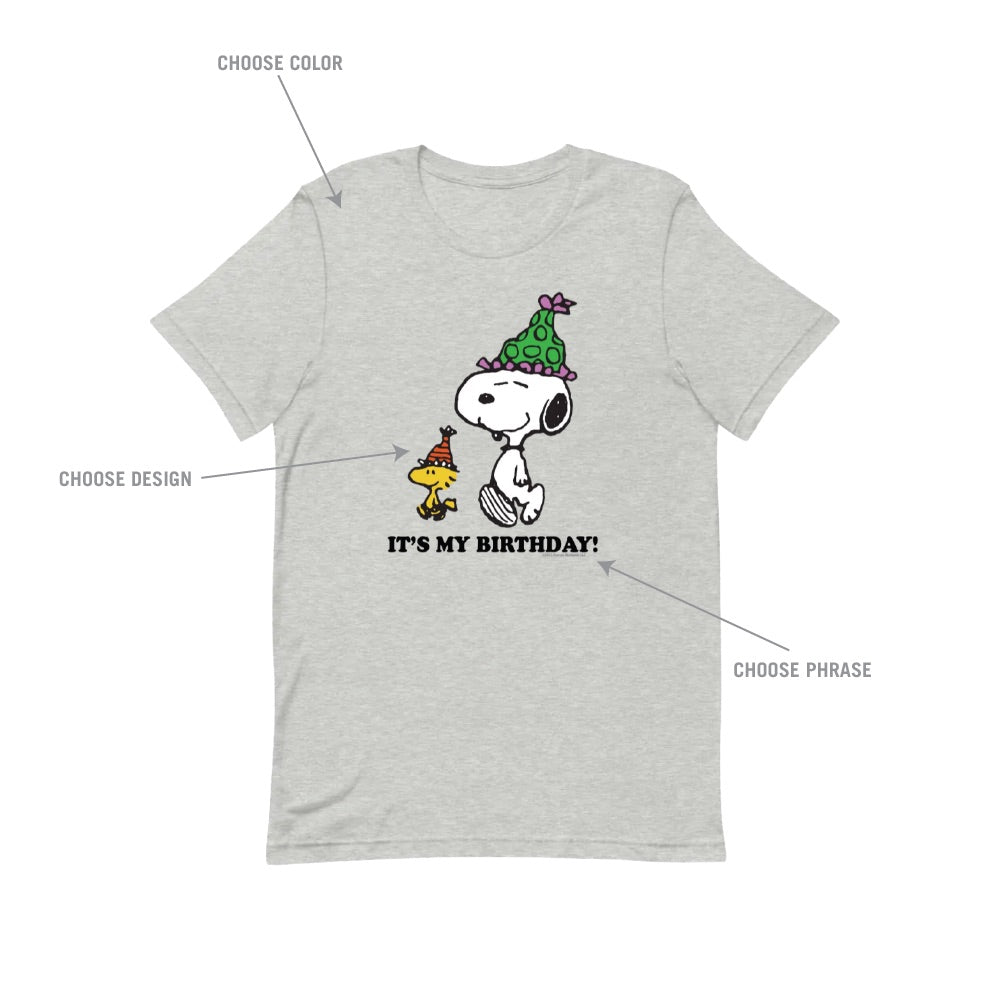 Pick between characters and sayings to make your own customized Peanuts Customized Birthday Adult T-Shirt.