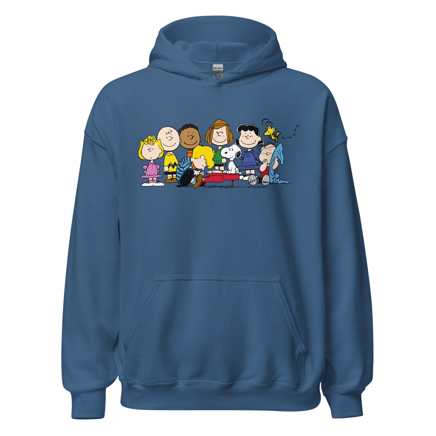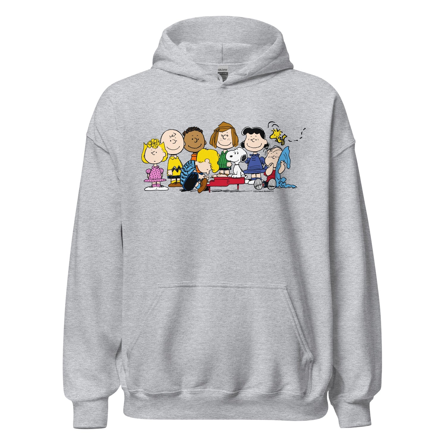 Show off your love for the Peanuts by wearing this soft and stylish hoodie everywhere you go. With a large front pouch pocket and drawstrings in a matching color, this Peanuts Gang Piano Adult Hoodie is a sure crowd-favorite.