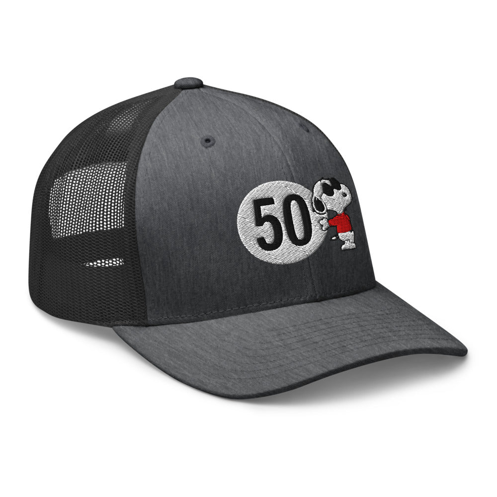 Celebrate 50 years of Joe Cool with this limited edition Peanuts Joe Cool 50 Trucker Hat. Perfect for Peanuts fans and vintage style lovers, this hat combines iconic style with comfort.
