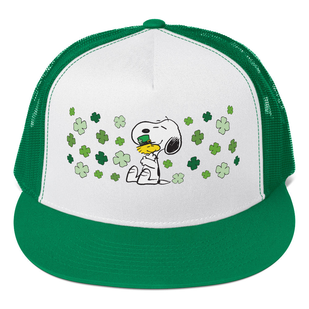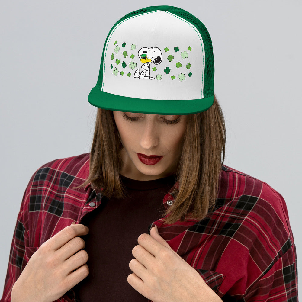 Top off your look with the Peanuts Lucky Trucker Hat! Featuring Snoopy and Woodstock surrounded by cheerful shamrocks, this festive hat is perfect for St. Patrick's Day and beyond. With a classic mesh back and adjustable fit, it's as comfy as it is lucky. Wear it and bring a little Peanuts charm wherever you go!