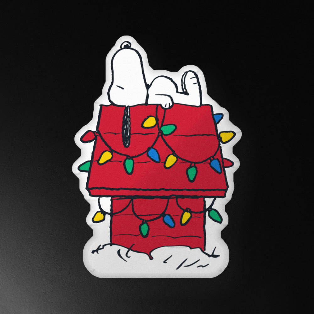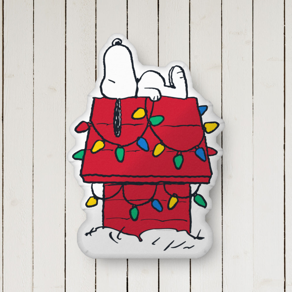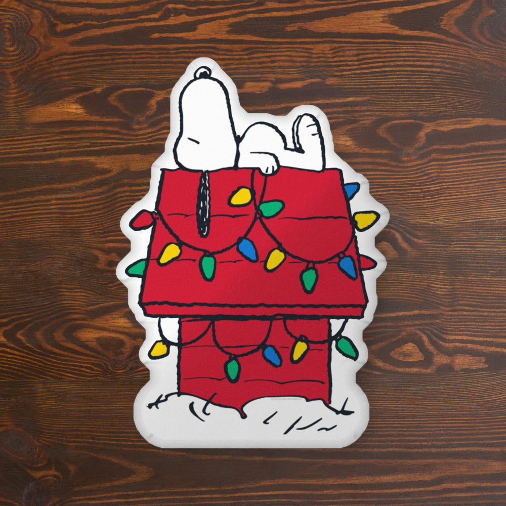 Snuggle up with festive charm with the Peanuts Snoopy Holiday House Pillow! Featuring Snoopy and his iconic doghouse decked out in holiday lights, this cozy pillow brings a cheerful touch to your home décor.