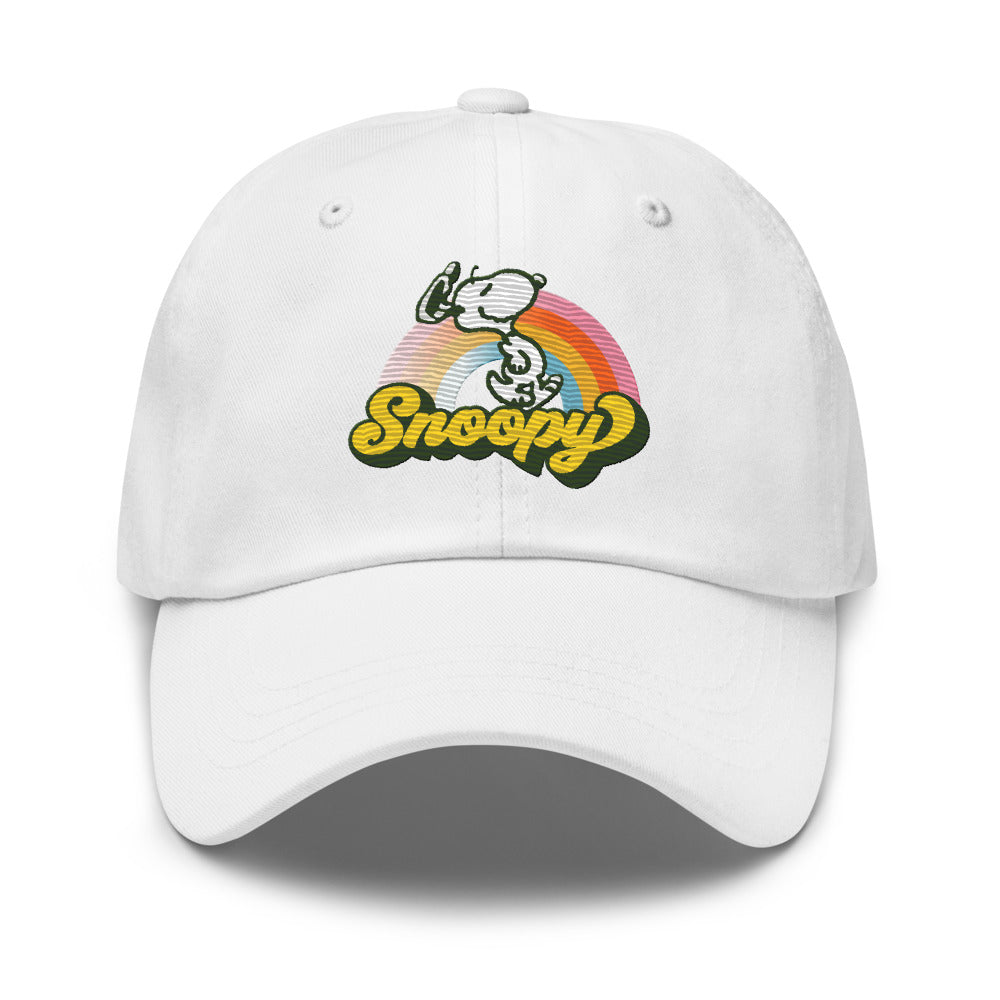Add a vibrant touch to your everyday look with the Peanuts Snoopy Rainbow Embroidered Dad Hat. Featuring a colorful, eye-catching rainbow design and the iconic Snoopy embroidery, this hat offers a playful yet stylish accessory for fans of the beloved Peanuts characters.
