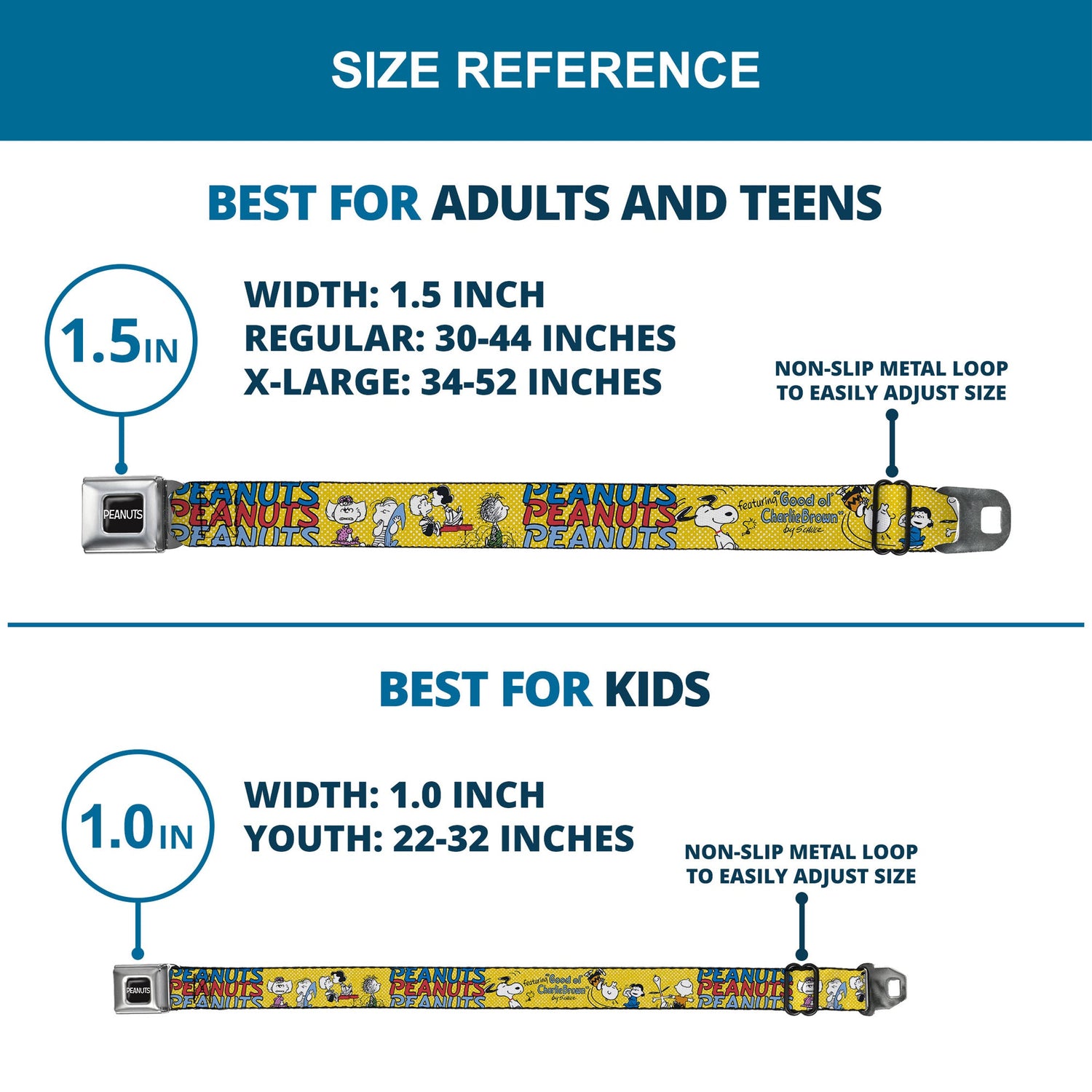 - Dimensions: Adult belts are 1.5 inches wide; kid belts are 1.0 inch wide.