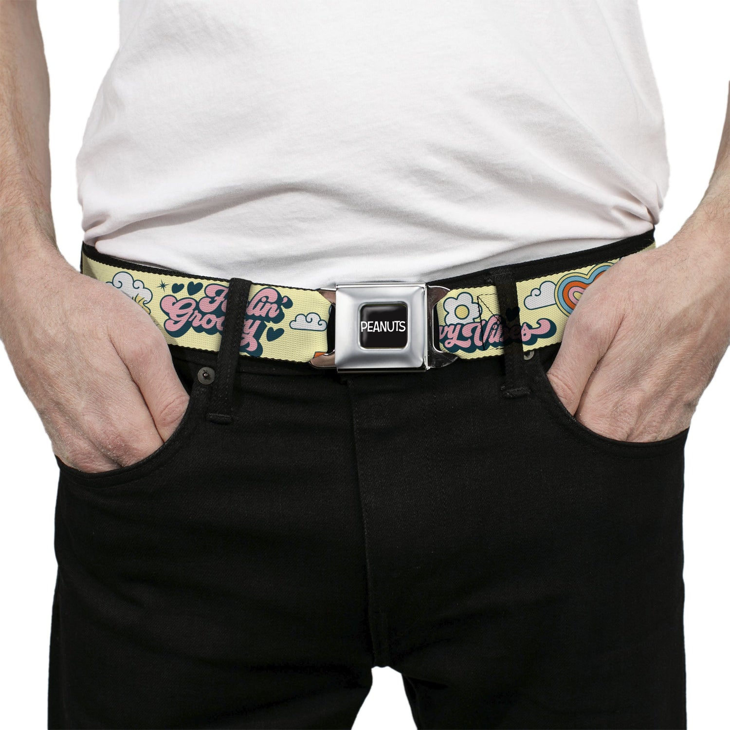This Peanuts Snoopy seatbelt belt from The Peanuts Store brings fun to your daily style. Featuring Snoopy as the Flying Ace and Woodstock surrounded by groovy quotes on yellow webbing, this belt is a true conversation starter. It uses an authentic automotive style buckle, making it easy to open and close with a push of a button. It adjusts to perfectly fit your waist, showing off your unique Peanuts style.