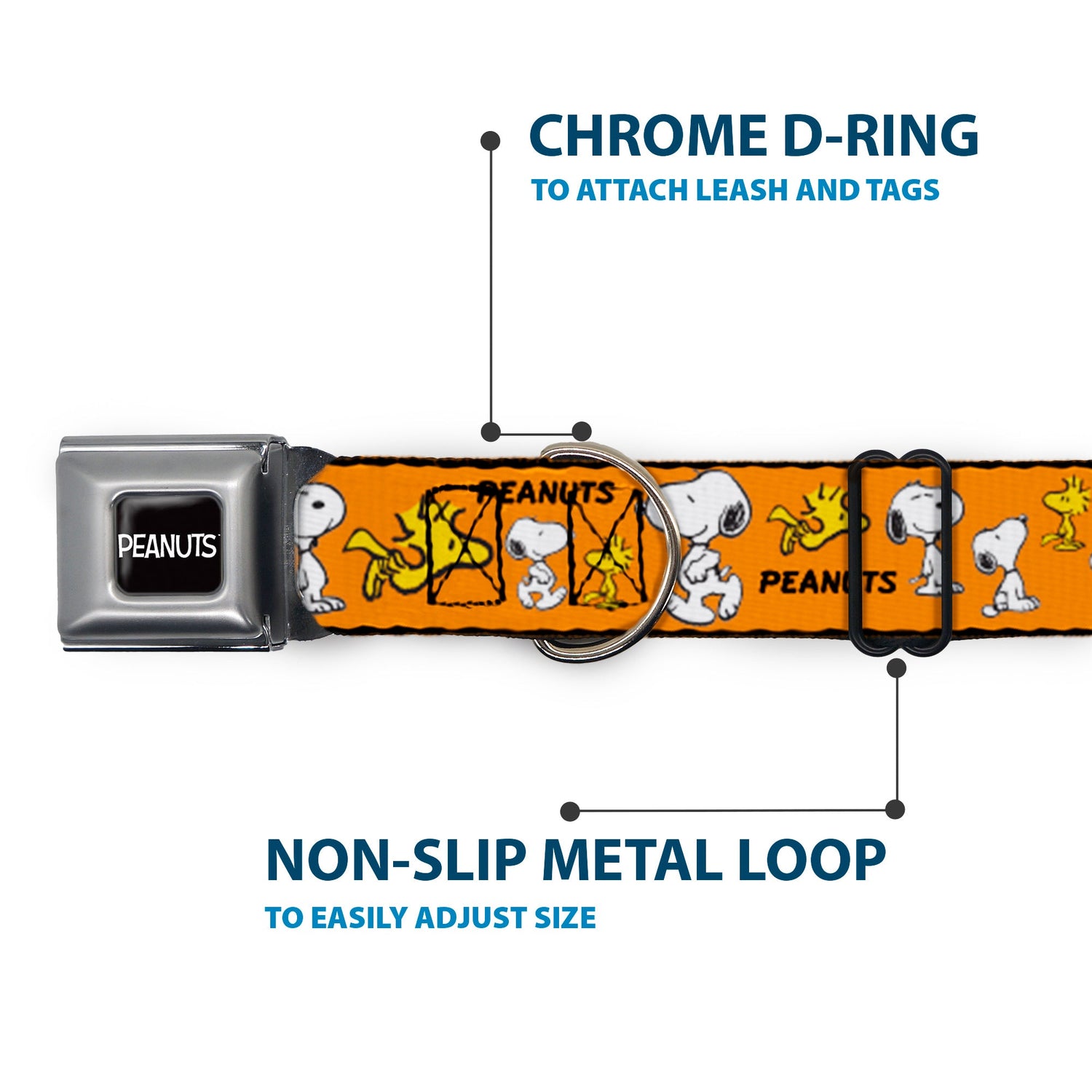 This Peanuts Seatbelt Dog Collar from The Peanuts Store will make your dog the talk of the town! It features beautiful vibrant artwork, such as the Snoopy and Woodstock Poses Collage Orange. The unique buckle is a miniature authentic Seatbelt Buckle; simply press the center button to release the clasp. This durable collar is available in various adjustable sizes. Matching leads and leashes are also available.