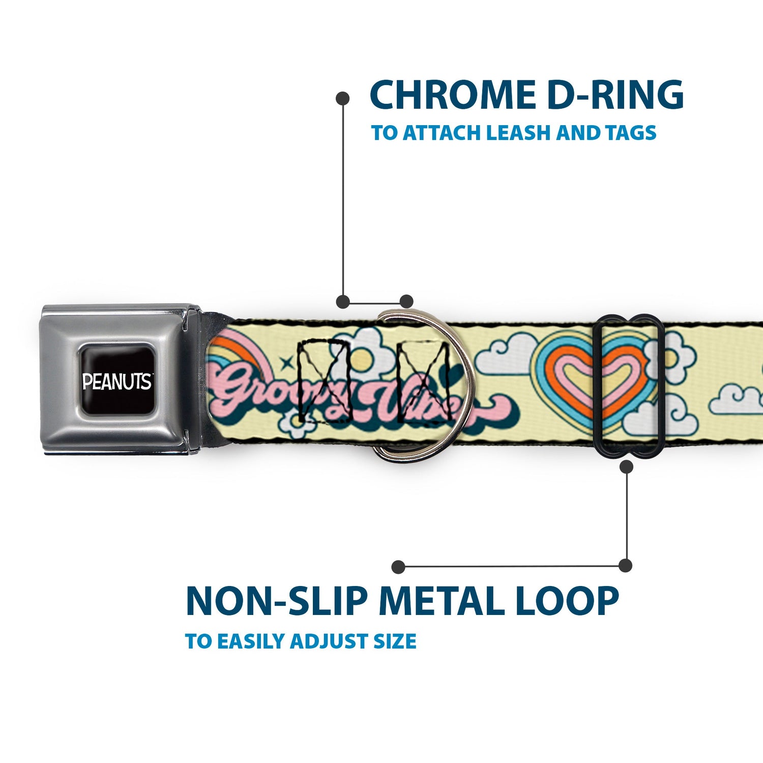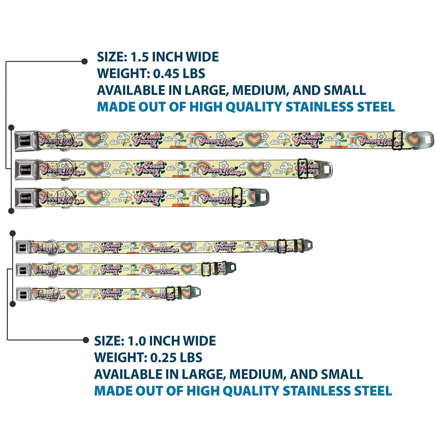 This Peanuts Store dog collar features a vibrant design of Snoopy Flying Ace and Woodstock quotes. Your dog will look fantastic in this unique seatbelt buckle collar. It's built to last and features beautiful artwork that truly stands out. The special buckle is a miniature seatbelt, so you simply press the center button to release it easily.
