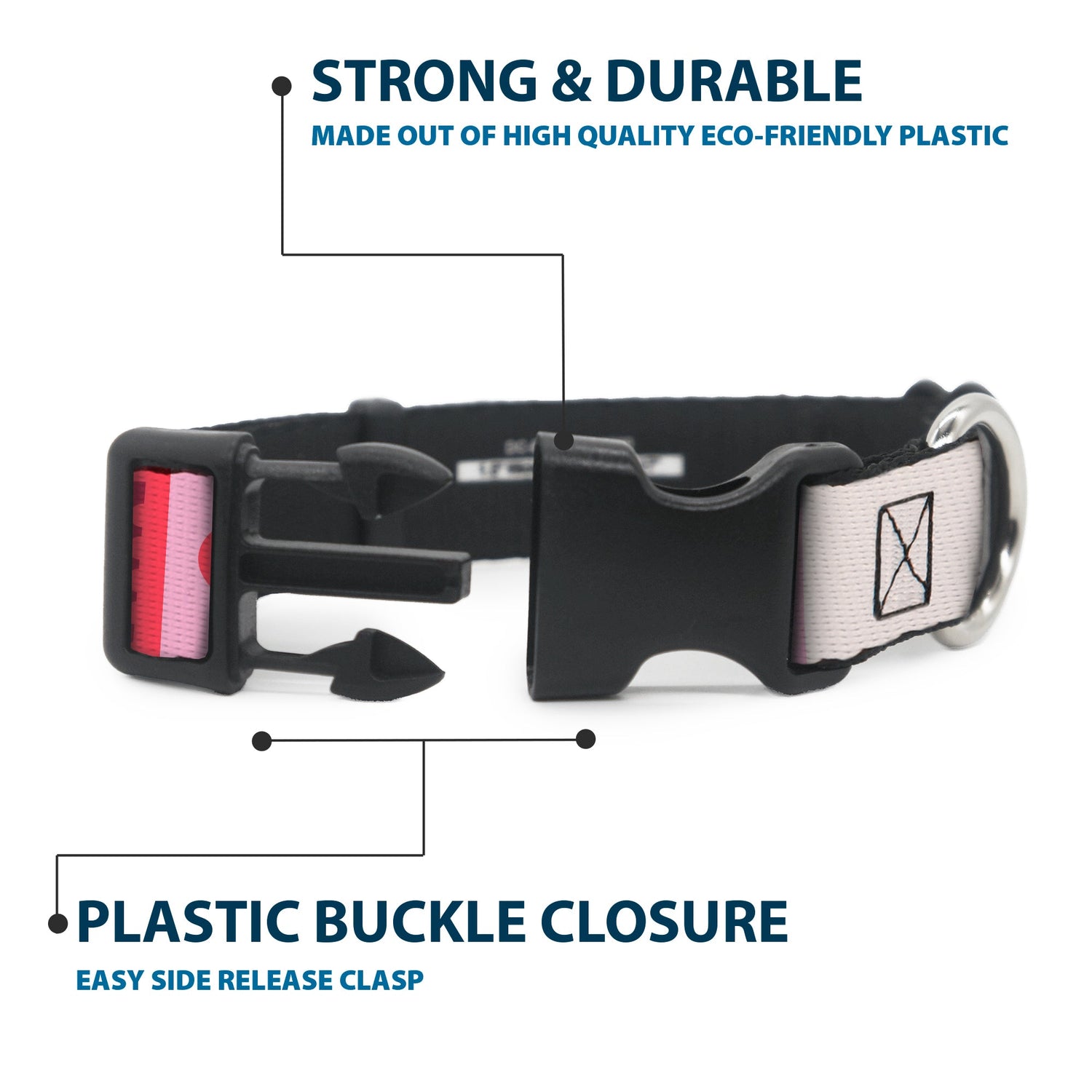- Materials: Polyester webbing, durable plastic buckle, strong metal D-ring
