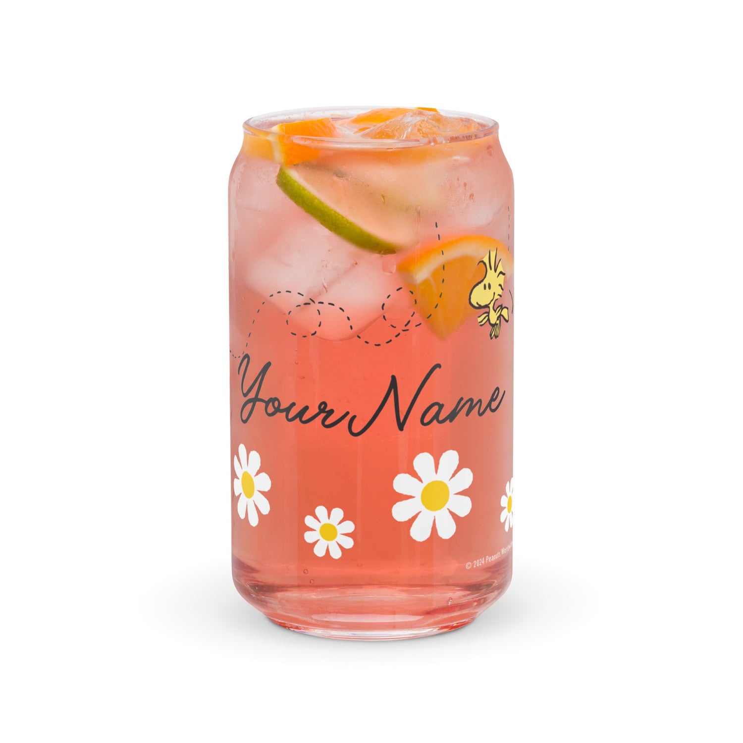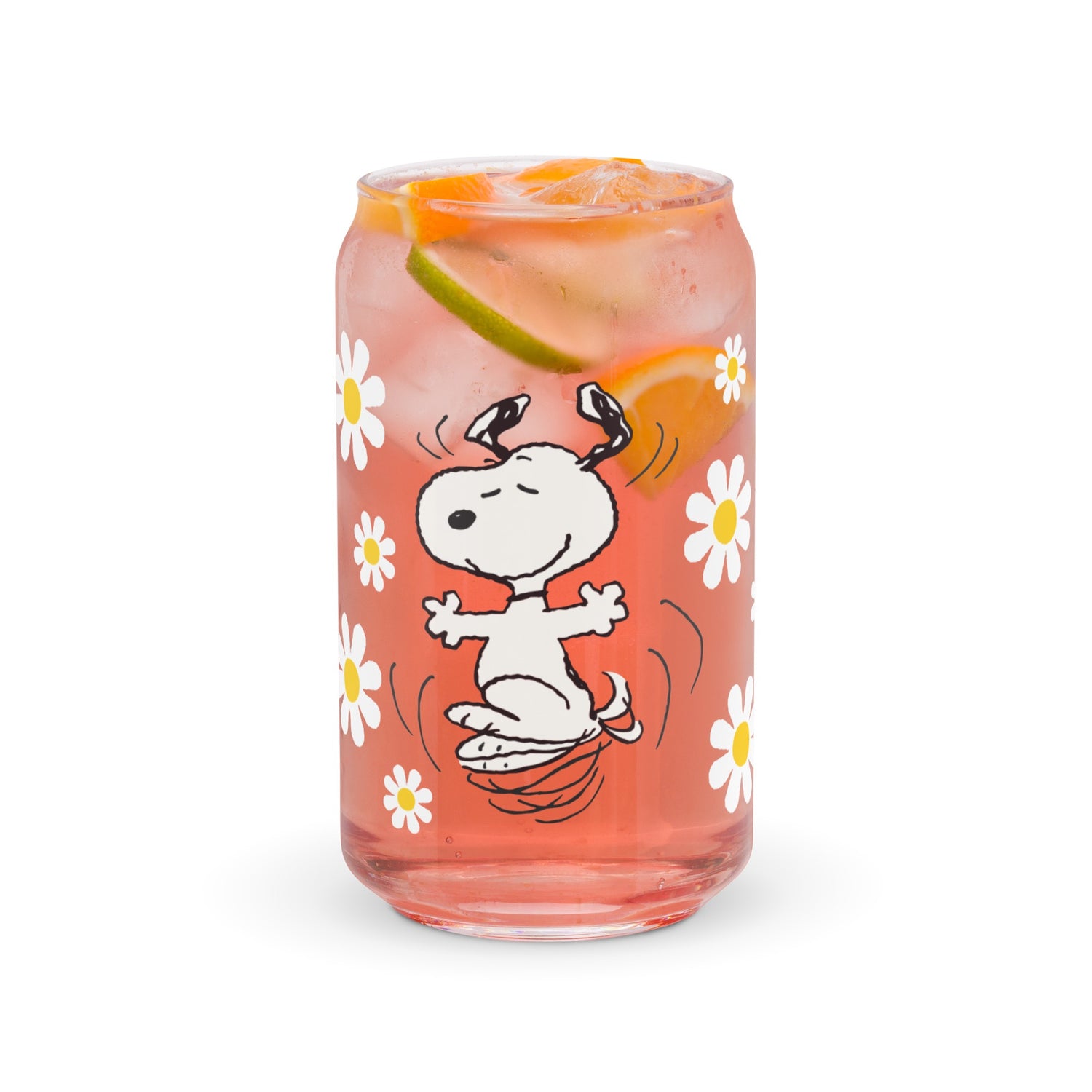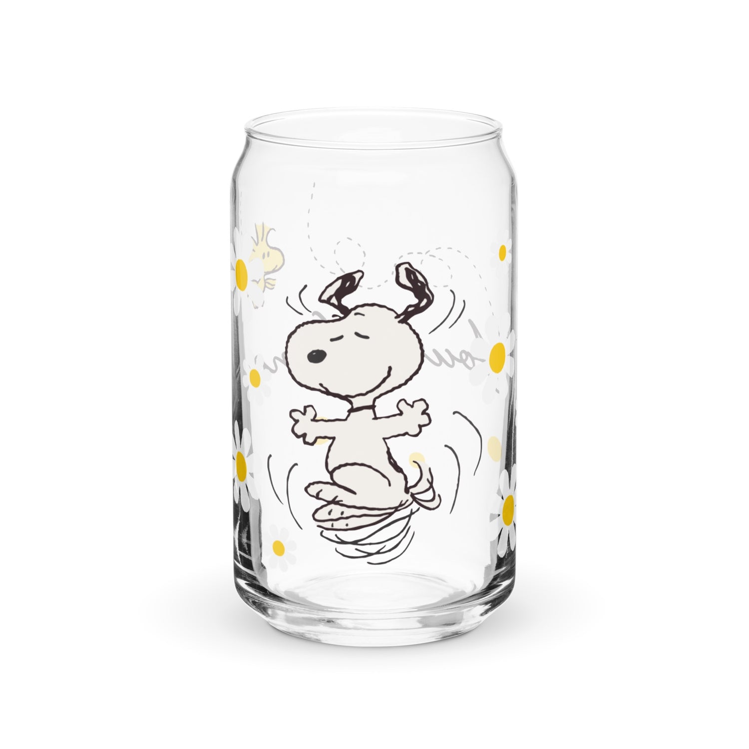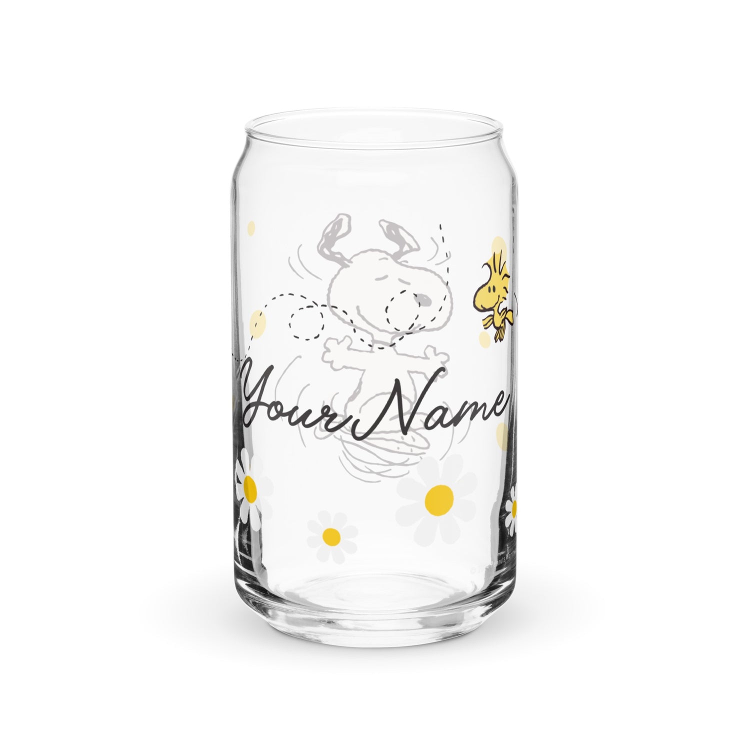 Snoopy and Woodstock with Flowers Personalized Can Shaped Glass