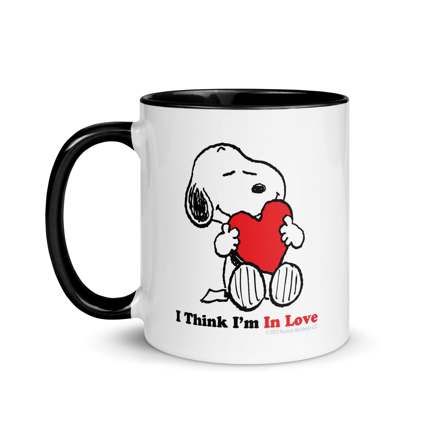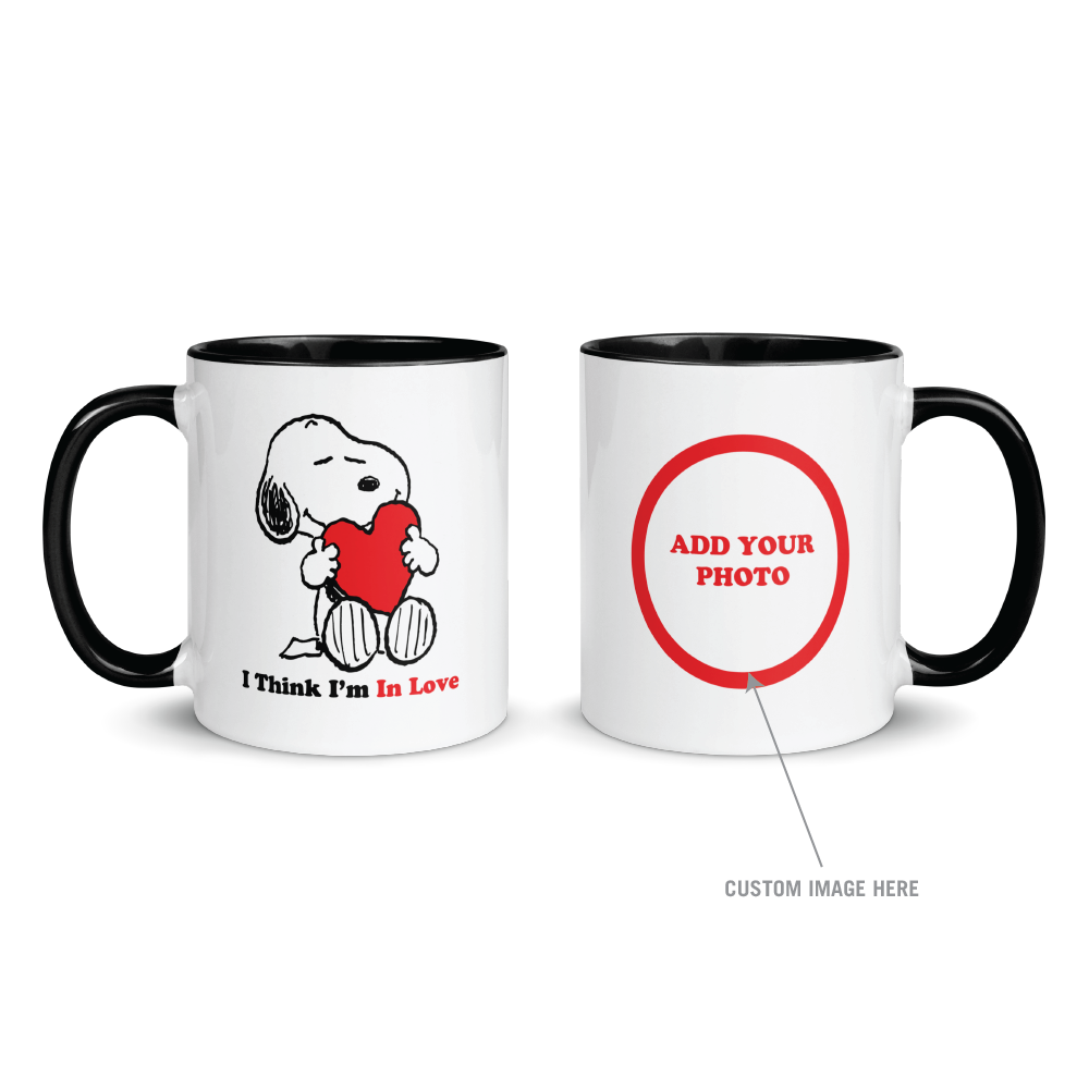 Start your day the Peanuts way! Enjoy a hot cup of coffee or tea in this Snoopy I Think I'm In Love Personalized Two Tone Mug.