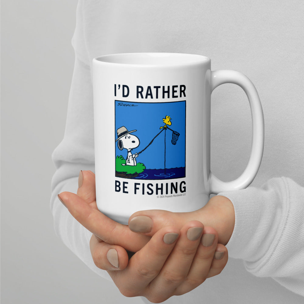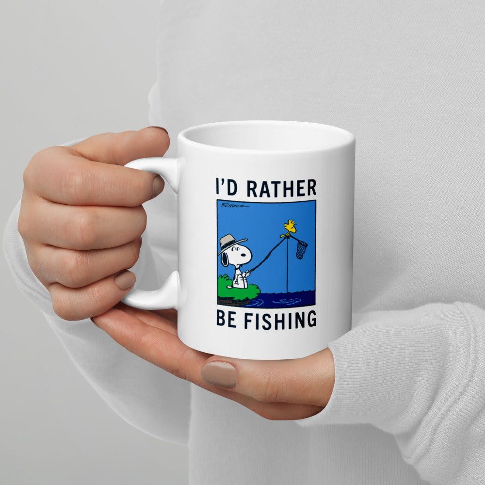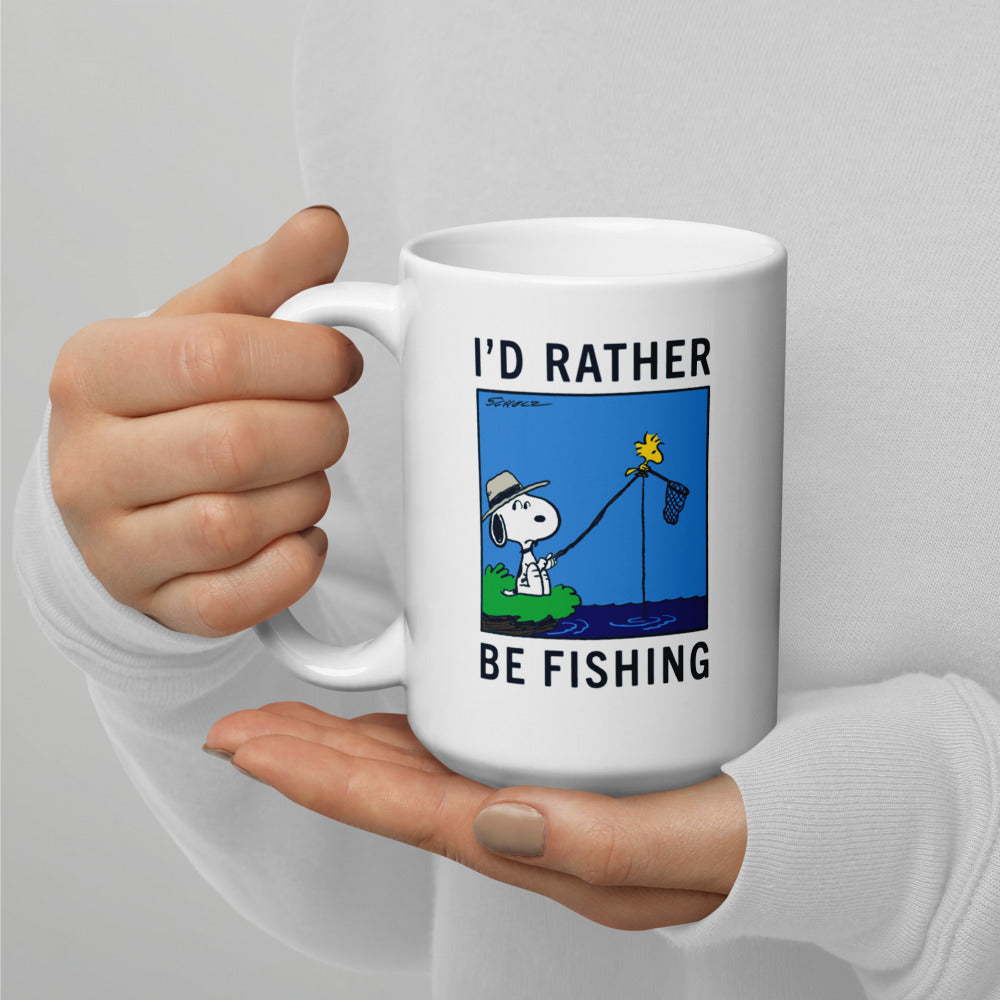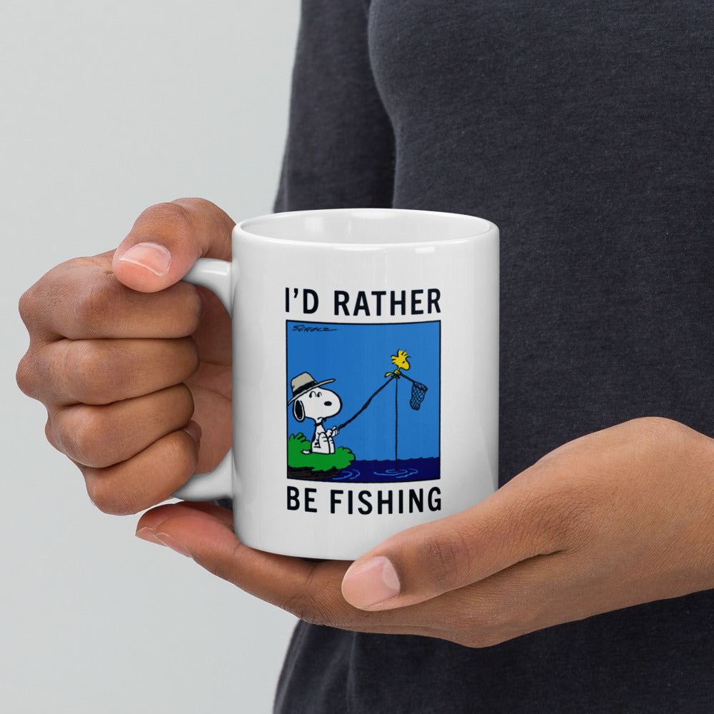 Indulge your love for the outdoors with our charming Snoopy 'I'd Rather Be Fishing' White Mug. Featuring everyone's favorite beagle, Snoopy, enjoying a relaxing fishing trip, this mug brings a touch of whimsy to your morning routine.