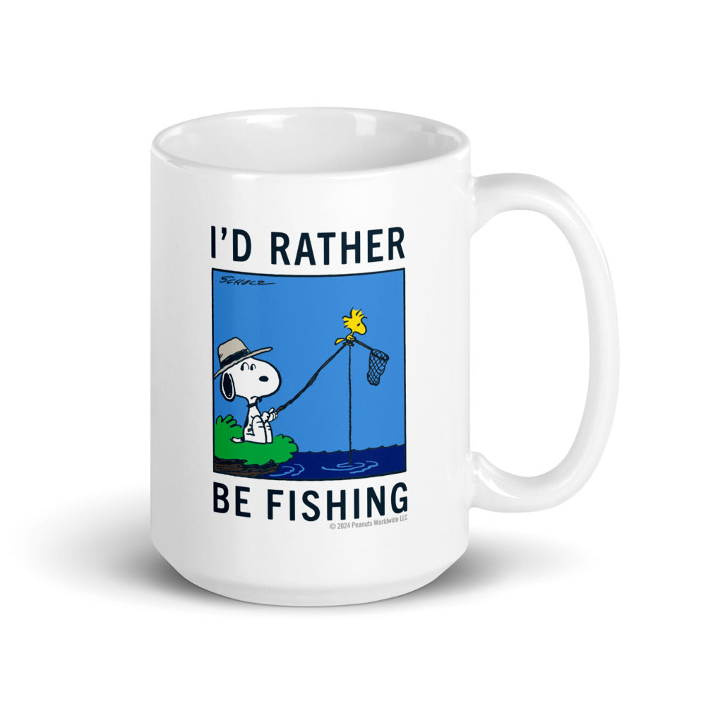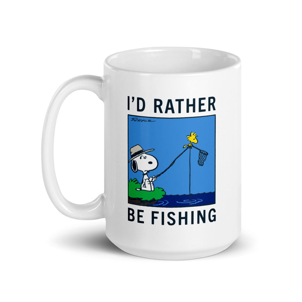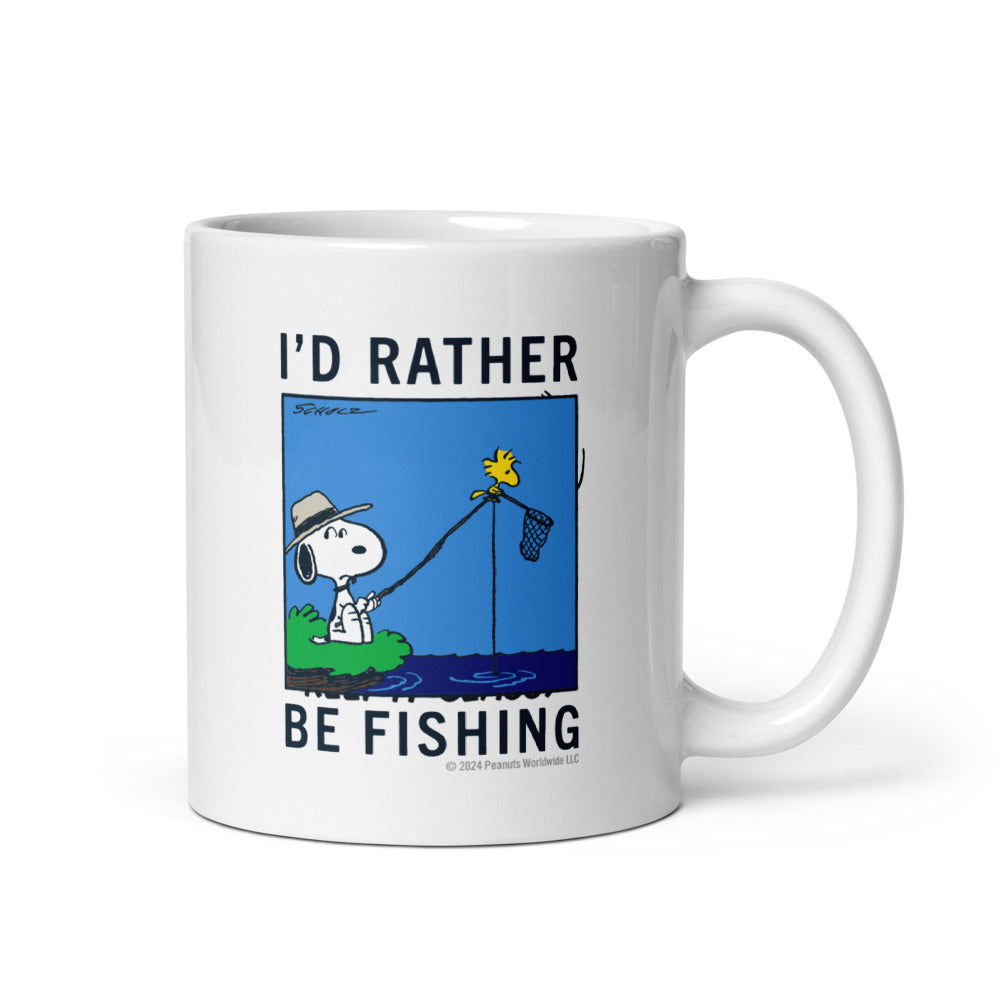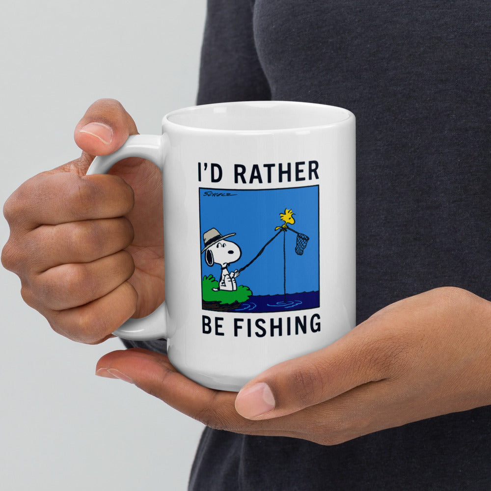 Indulge your love for the outdoors with our charming Snoopy 'I'd Rather Be Fishing' White Mug. Featuring everyone's favorite beagle, Snoopy, enjoying a relaxing fishing trip, this mug brings a touch of whimsy to your morning routine.