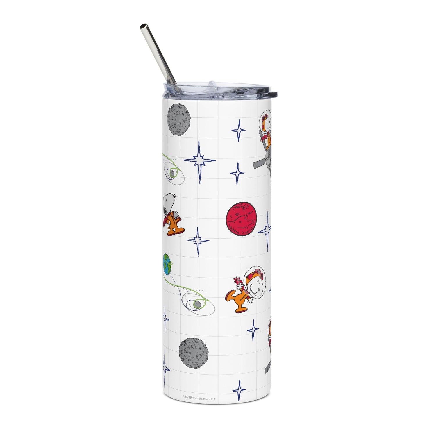 This Peanuts skinny tumbler is the perfect way to drink with ease. Sip in style with the Snoopy Planets Pattern Skinny Tumbler.